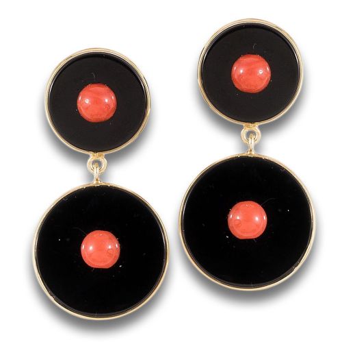Long double earrings in gold-plated silver. Made of onyx and coral cabochon centre. Omega closure system.
