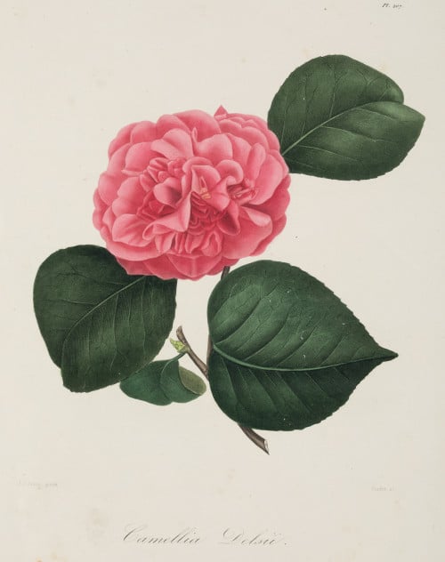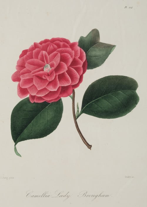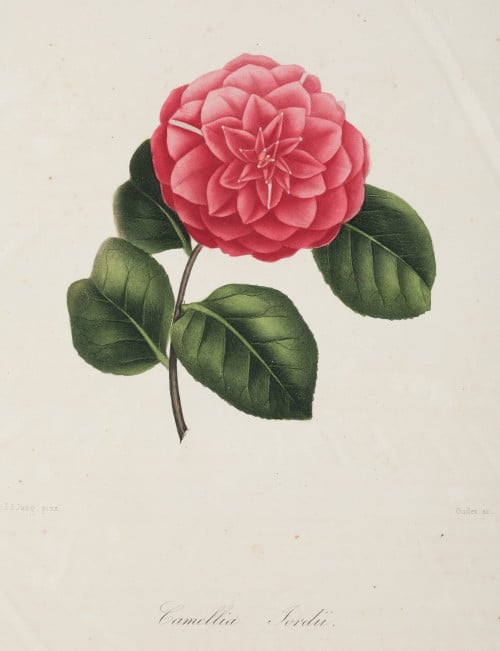 6 hand-colored dotted engravings Painted “d'après nature” by JJ Jung. For Berlese: “Iconographie du Genre Camellia, ... les plus beau et les plus rares..” Paris, 1843. - Camellia Arnoldi - Camellia Delsii -Camellia Amabilis - Camellia Lady Broughman - Camellia Fordii -Camellia Amiri Measurements: Footprint: 28 .4 x 22.3 cm each