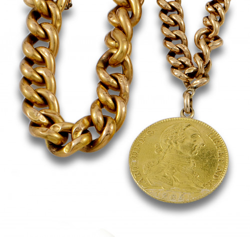Lote de dos pulsera barbadas de oro rosa de 18 kt. una de ellas con moneda de 4 escudos de Carlos III, de oro. Peso: 35.40 Gr..