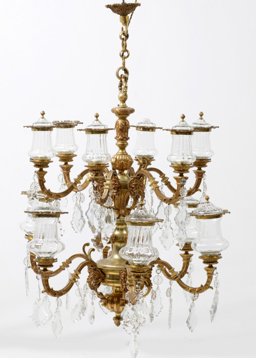 Lámpara de techo de doce luces, en dos alturas, en bronce y metal dorado con motivos de mascarones en el arranque de los brazos. Puntos de luz con tulipas.