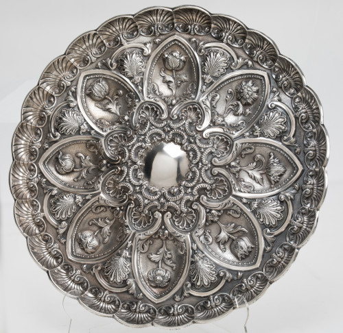 Circular shape with concentric decoration of floral motifs, palmettes, acanthus scrolls and egg reserves. Diam: 50 cm.