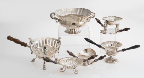 Lot consisting of five silver studs and a Silver metal center. Of different manufactures, decorations and nationalities. Carved wooden handles. Center with wavy profile, gallon base and scroll handles. With engraved initials. Total weight of the chops: 440 gr. Measurements: 11 x 24 cm, the largest.
