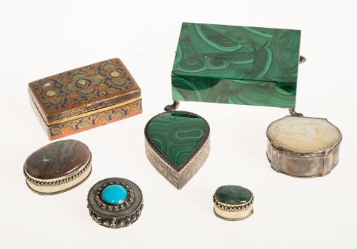 20th century. Several of hard stones (malachite, agate...). A silver stand. Another of mother-of-pearl, and one with enamel decoration. Some missing. Measurements from 2 x 3 cm to 10 x 13 cm.