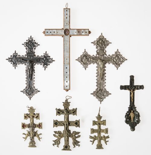 A collection comprising: a Jerusalem Cross in wood and mother-of-pearl, three Caravaca Crosses in gilt bronze, a hanging Cross in patinated and gilt metal, and two openwork Crucifixes in 16th-century Spanish silver (Weight: 300 g). 20th century. Missing pieces. Largest dimensions: 21 x 156 cm.
