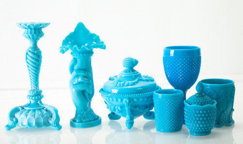 All of them made in mold. Composed of a glass, two glasses, a candlestick, a candy bowl, a vase and a container with a lid. Small faults. Measurements: 24 cm, the candlestick