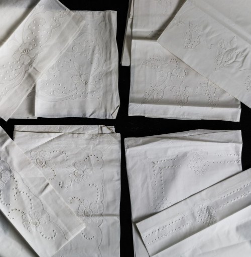 Lote compuesto por cuatro juegos de cama, compuestos por sábana y almohada, en hilo blanco con diferentes decoraciones bordadas. Para cama de 150 cm.