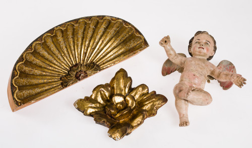 Lote compuesto por: dos remates en madera tallada y sobredorada y una figura de angelote de madera tallada y policromada, ffs. S. XIX. Perdidas en el dorado y policromía.