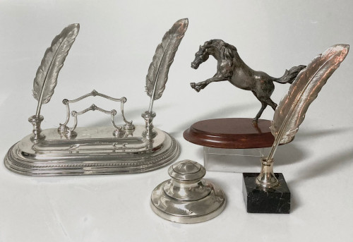 Lote compuesto por tintero, pluma y figura de caballo de pl