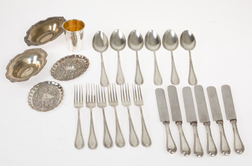Lote de plata compuesto por bandejita, dos ceniceros y vaso.