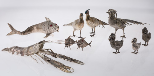 Lote de 10 figuras de animales en plata española ley 916: una langosta, un pavo real, dos faisanes, tres peces y tres pollitos.