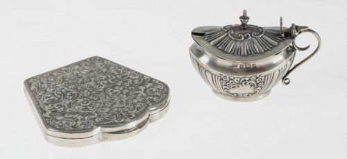 Lote formado por cajita polvera con decoración de entrelazos e interior con espejo, ley 800; y salerito en plata sterling inglesa, con interior de cristal azul. Peso total conjunto: 190 gr.