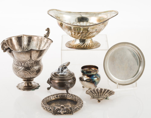 Lote de plata compuesto por salsera y centrito con asas laterales. 620 gr.