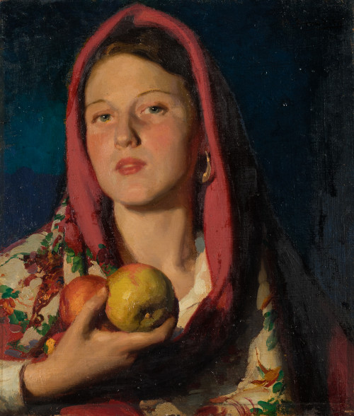 En los últimos años 20 y primeros 30, la modelo habitual de Benedito fue Erna Florencia Becker, actriz hispanoargentina que protagonizó algunos filmes en los últimos años del cine mudo y primeros del sonoro. El cromatismo del pañuelo rojo, el estampado del vestido y las manzanas riman con los tonos de su piel y enmarcan un rostro de singular belleza. La obra fue expuesta en numerosas ocasiones (entre otras, Bienal de Venecia, 1934; Valencia, 1935; Casino de Madrid, 1944; Real Círculo Artístico de Barcelona, 1947; Arte español contemporáneo, Buenos Aires y Sao Paulo, 1947; Madrid, 1958)