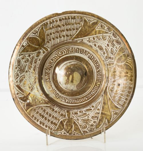 Triana earthenware dish with a metallic sheen, 16th century. The rim is decorated with triple leaves, surrounded by scallops and florets. The central motif features a wolf'head. The reverse features concentric ring decoration. It has minimal restoration work. Diameter: 33.5 cm.