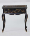 Mesa auxiliar de gusto inglés siguiendo modelos del S. XVIII. Policromada imitando laca de gusto oriental. Pequeñas faltas.