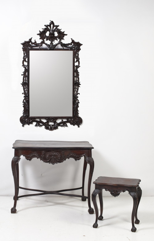 Mesa auxiliar estilo Luis XV, Francia, S. XX. De madera tallada y teñida de caoba. Patas de garra.