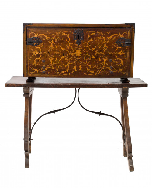 Mesa castellana de nogal, España, S. XVIII y posterior. Con patas de lira y fiadores de hierro.