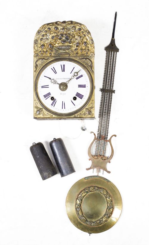 Gilded brass box with cup decoration with flowers and fruits on the top. Dial signed "Federico Carranza, Burgos". Attach pLateulum and weights. Faults and need review. Measurements: 41 x 25 x 15 cm, the box