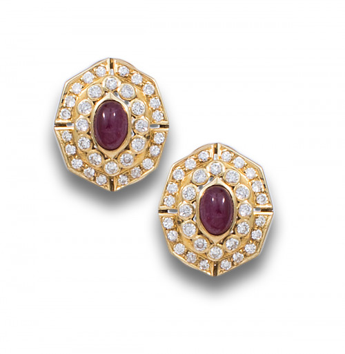 Pendientes años 80, de oro amarillo de 18 kt. Formados por cabujones de rubíes ovales, engastados en chatón y con doble orla de diamantes, talla brillante, engastados en grano y en chatón. Sistema de cierre omega.