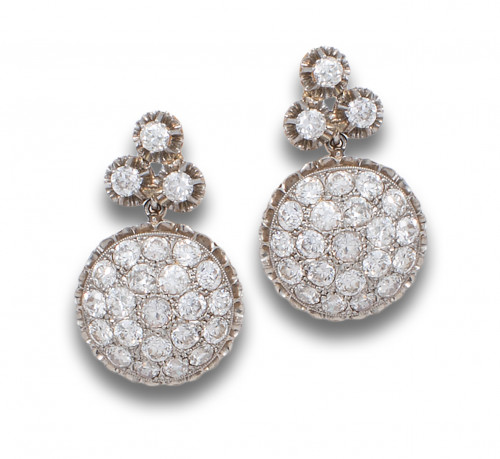 Pendientes colgantes antiguos de ora amarillo de 18 kt. con vistas en platino. Formados por tríos de diamantes, de los que penden rosetas de diamantes, talla antigua, peso total estimado de 6 ct. Engaste en grano.
