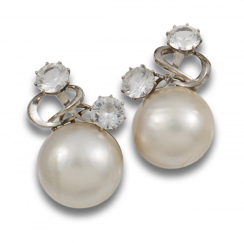 Pendientes en oro blanco de 18 kt. con perlas japonesas y montura con circonitas en garra. Peso: 10.60 Gr..
