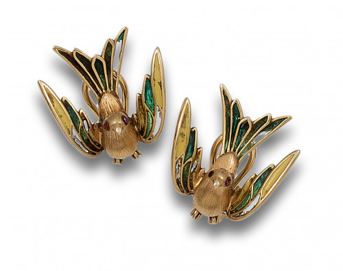 Pendientes en oro amarillo de 18 kt. y esmaltes en forma de pájaro. Sistema de cierre omega. Peso: 10,9 Gr..