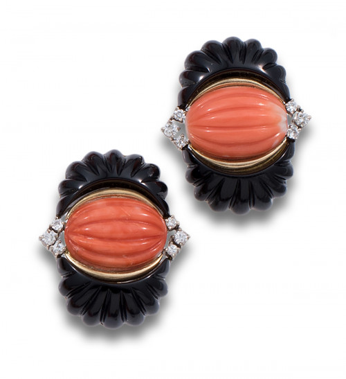 Pendientes firmados LUIS GIL, de oro amarillo con vistas en blanco de 18 kt. Centro de coral y laterales de ónix con diseño gallonado y remates de diamantes, talla brillante, engastados en garras. Sistema de cierre omega.