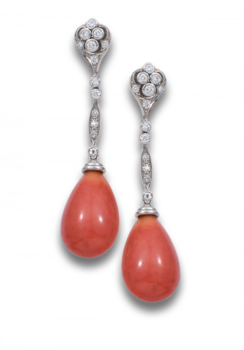 PENDIENTES LARGOS DE DIAMANTES, CORAL Y ORO BLANCO