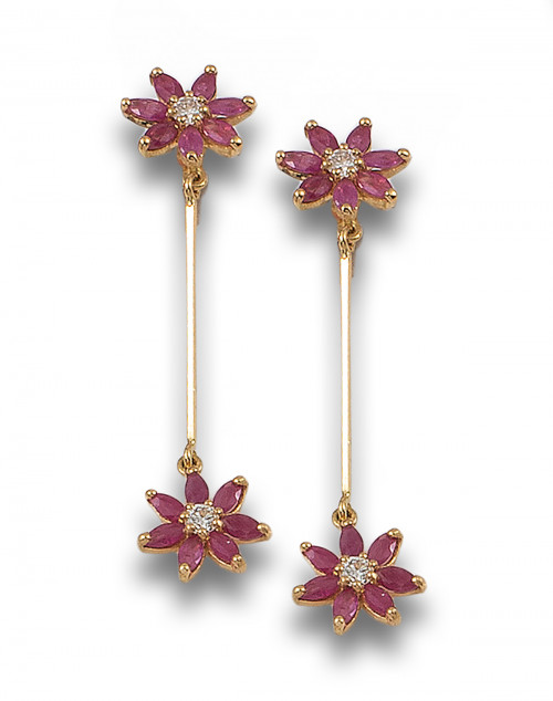 PENDIENTES LARGOS DE FLORES DE DIAMANTES, RUBÍES Y ORO AMAR