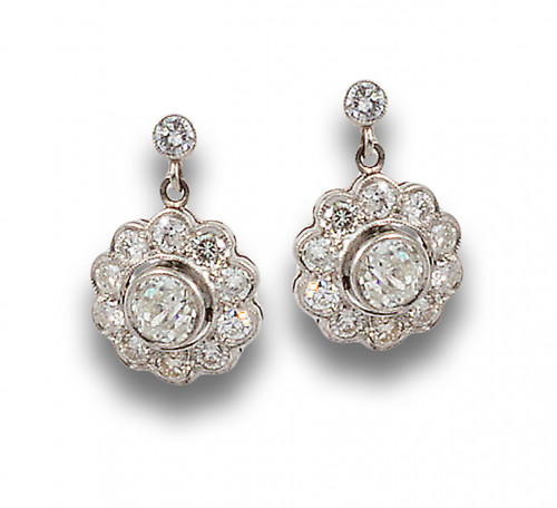 PENDIENTES ROSETONES, ESTILO ANTIGUO, DE DIAMANTES Y PLATIN