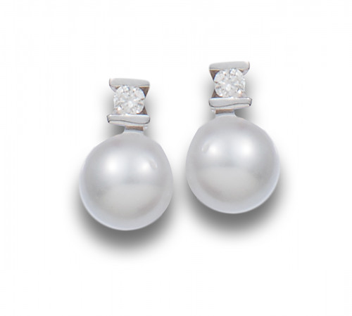 Pendientes tú y yo de oro blanco de 18 kt. Formados por diamantes, talla brillante, peso total estimado de 0.25 ct. y perlas australianas calibradas en 10 mm. de diámetro. Sistema de cierre omega.