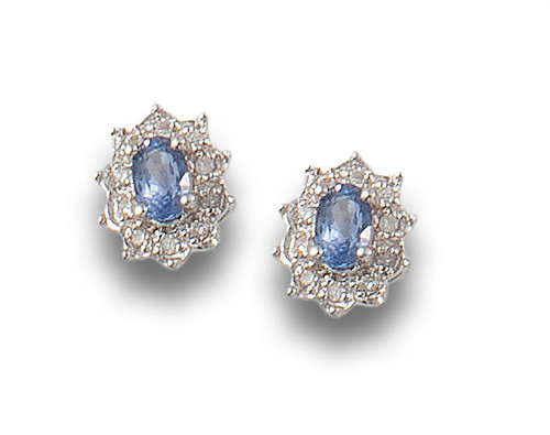 Pendientes rosetones de oro blanco de 18 kt. con centro de zafiro oval y orla de brillantes.