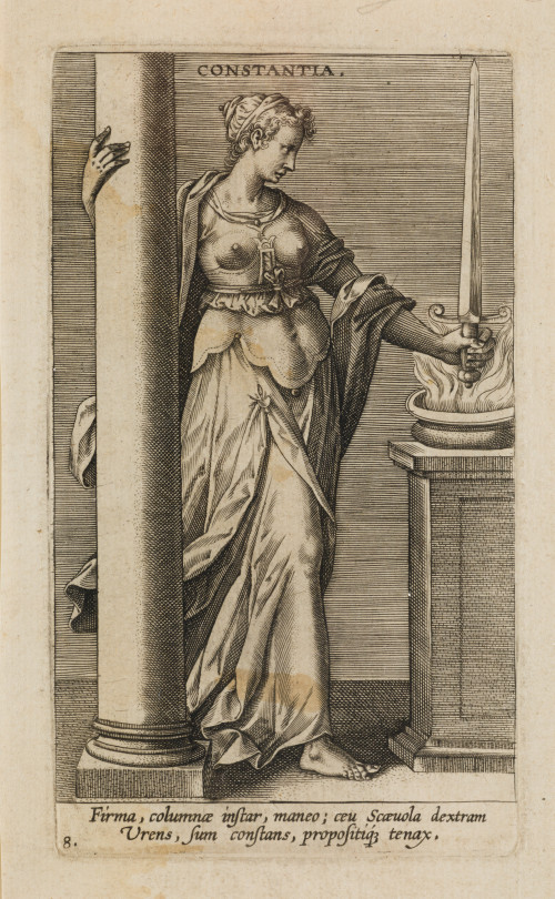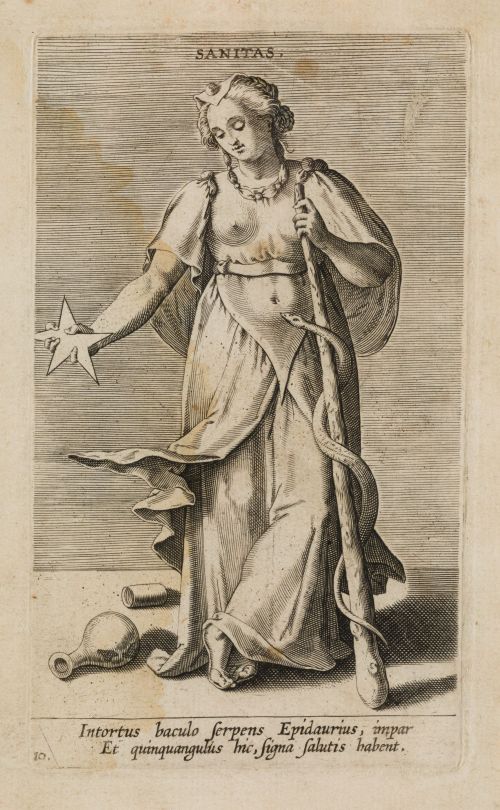 Two copper engravings Represents Health with staff, serpent and a Pentacle, and Constancy, firm as a column, constant and tenacious with their purposes. Measurements: Paper: 16 x 11 cm; Footprint: 14 x 9 cm each
