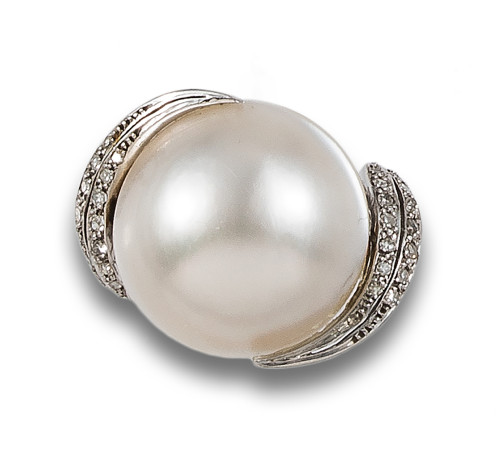 PLATINUM RING WITH MABE PEARL AND DIAMONDS