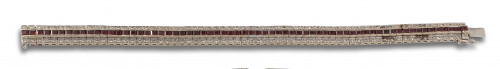Pulsera de oro blanco de 18 kt. con montura calada, compuesta de rubíes calibrados en talla carré y diamantes talla brillante, peso total estimado 1.30 ct.