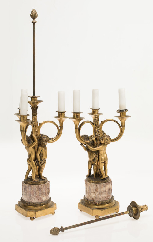 Made of gilded bronze with three points of light in the shape of trumpets held by three putti. Gilded bronze and marble base. Faults, a loose shaft and losses of gold. Measurements: 77 cm high each without screen.