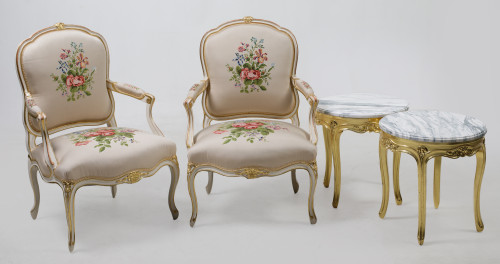 Made of carved and gilded wood. With white marble top and green veins. Measurements: 52 x 51 cm each