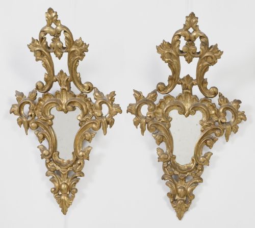 Made of carved, openwork and gilded wood with rocaille decoration. They have small flaws and restorations. Measurements: 60 x 34 cm each.
