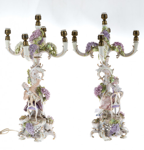 Pareja de candelabros de cinco luces de porcelana alemana de Plaue S.XIX. Pie en forma de tronco vidriado en blanco con pareja dieciochesca y ramilletes de flores en lila y blanco. Marcas en la base.Minimos desperfectos. Adaptados a luz eléctrica.