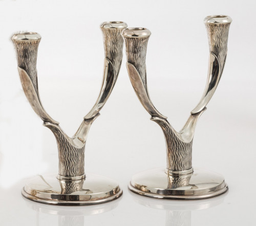 Pareja de candelabros de dos luces en plata española, Ley 9