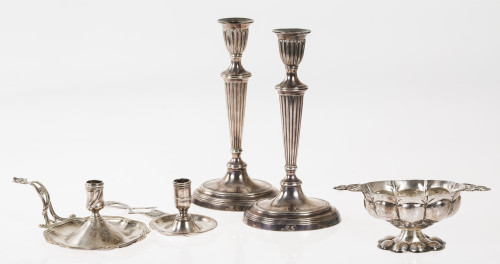Pareja de candeleros en plata española, con marcas de Cádiz