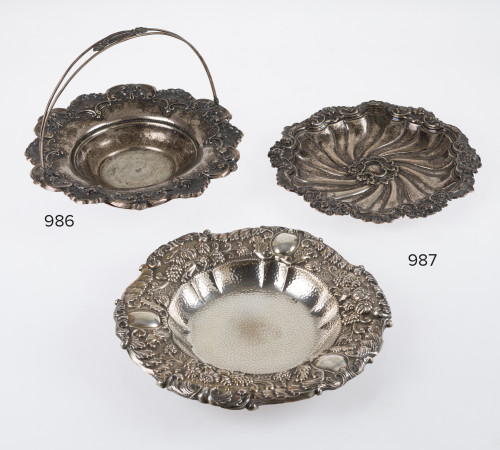 Pareja de centros en plata. Uno, con marcas de plata española ley 916, con greca de frutos y espejuelos al borde (28 cm) y el otro, con superficie de gallones y greca de volutas (27 cm)