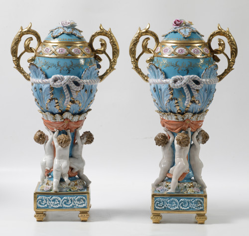 Pareja de copas de porcelana siguiendo modelos alemanes, S. XX. Con decoración de putti en la base, realces dorados y tapas rematadas en flores. Marca en las bases siguiendo la de Sevres.
