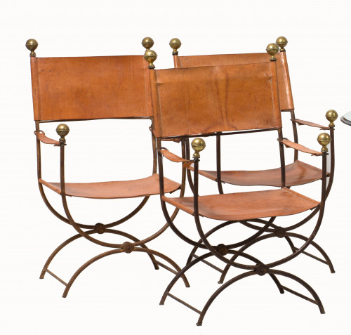 Pareja de jamugas de hierro y remates de bronce dorado con asiento, brazos y respaldo de cuero, España, med. S. XX. Manchas en el cuero.