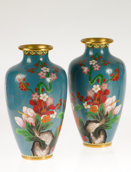 Pareja de jarrones orientales, en esmalte cloissoné con decoración floral en policromía, sobre fondo azul. Altura: 26 cm.