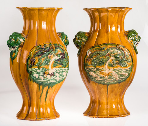 Pareja de jarrones orientales en cerámica vidriada en ocre, con decoración de reservas con dragones y cabezas de leones con anillas en los laterales. Medidas: 65 x 49 x 32 cm.