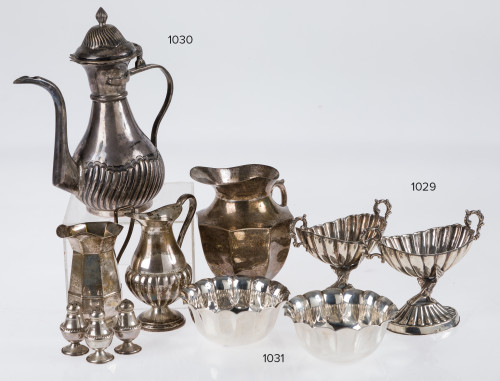 Pareja de lavafrutas y tres saleros de plata, S. XX.