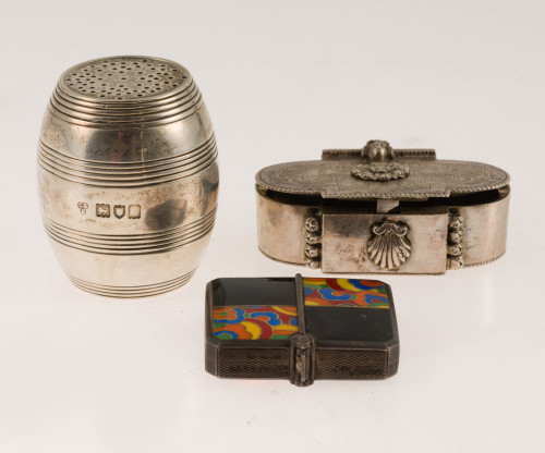 Pastillero de plata S.XVIII, sistema de apertura con mecanismo secreto. Peso: 75 gr. Medidas: 2 x 6,5 x 4 cm.