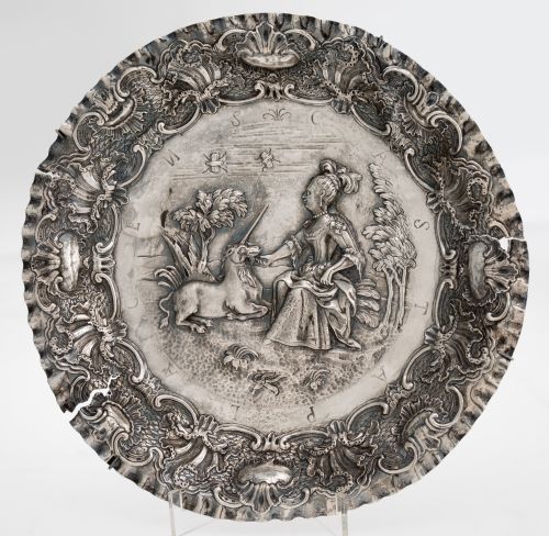 Decoration highlighted with a central scene of a lady with a unicorn as an allegory of chastity, and a rockery fretwork on the edge. Fouls. Weight: 695 gr. Measurements: 41 cm in diameter