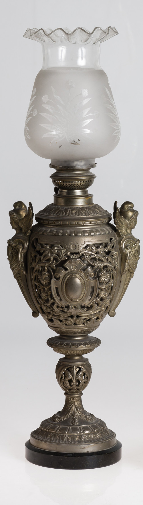 Quinqué en metal dorado con decoración al gusto renacentista. Tulipa de cristal decorada al ácido.